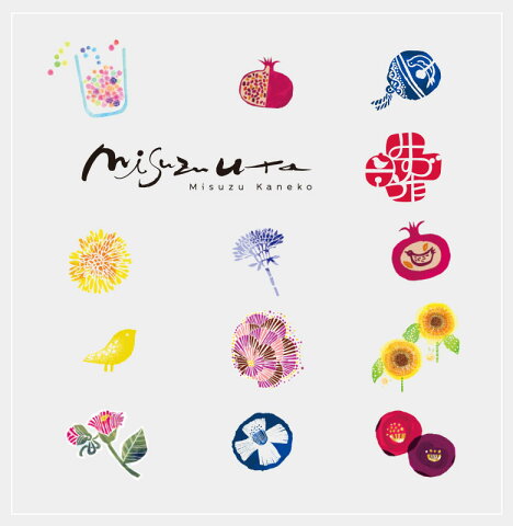郵便局の椿、私と小鳥と鈴と、など金子みすゞの詩とデザインがひとつになって、表現されるみすゞ詩の世界観が楽しめます。